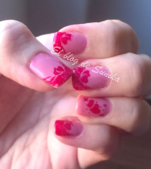 El esmalte de Masglo es un color rosa bebe muy bonito pero hay que dar tres capas para que quede realmente bonito el color. El rojo de Astor es precioso pero un poco líquido para estampar aunque con paciencia y cuidado se puede utilizar sin problemas.