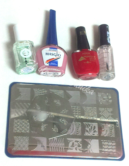 Para realizarla usé dos placas distintas para estampar, no son de ninguna marca conocida, el esmalte Estupenda de Masglo (ya sabéis que me encantan sus esmaltes) y el rojo es de Astor. Como siempre mi base de Essie que me encanta y para finalizar un brillo de Yves Rocher, la verdad es que es con el que más me aguantan las manicuras de todos los que he probado.