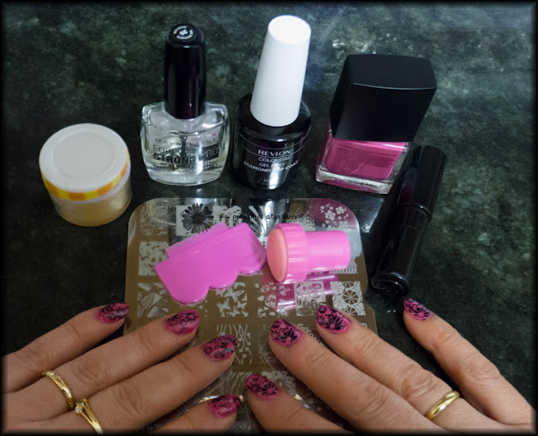 Estos son los esmaltes utilizados. Primero me he puesto el endurecedor que os enseñé en la entrada anterior, a continuación una base con un fortalecedor de Maybelline. Después he dado dos capas de esmalte rosa y una capa de top coat de Revlon, para que se me seque antes. Lo he dejado un buen rato para que se endurezca un poco el esmalte. Luego he estampado el dibujo con el esmalte negro que cogí en Aliexpress y otra capa de top coat para que me dure más tiempo. De esta forma me aguanta bastante más tiempo la manicura.