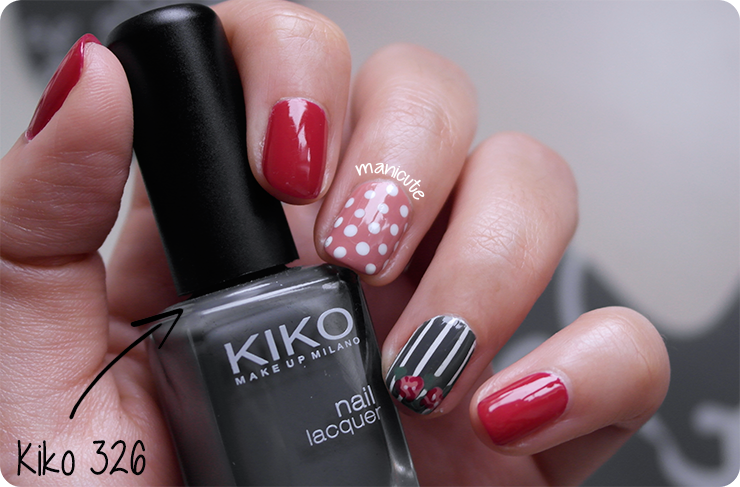 Para la uña del dedo anular, donde van las flores, he utilizado el 326 de KIKO. Es un gris marengo que me tiene enamorada. Me cuesta mucho darle salida en verano o primavera, pero para otoño invierno es... ¡sencillamente genial!