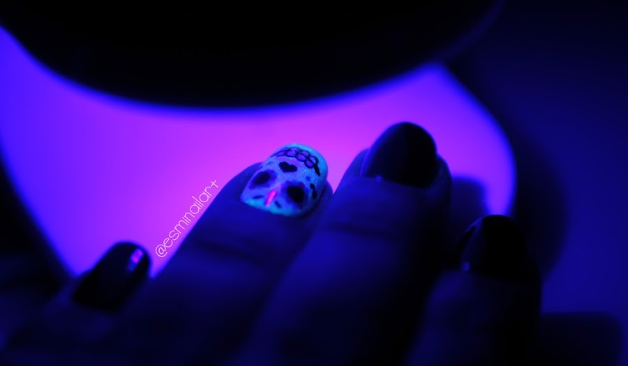 Además, en esa misma uña, tras aplicar el esmalte blanco apliqué un top coat glow in the dark (vamos, que brilla en la oscuridad) de la marca Essence. De esta manera, con la luz apagada brillaba la uña, pero no la calavera
