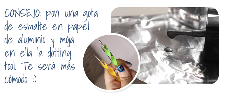 Además, la herramienta principal que utilizamos es la dotting tool; si no tenéis, podéis usar pinceles más finitos e incluso, como siempre os digo, un palillo con la punta un poquito recortada con una tijera.