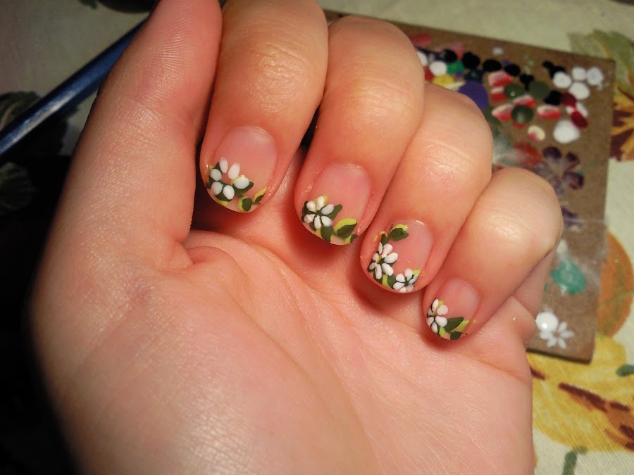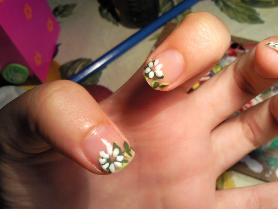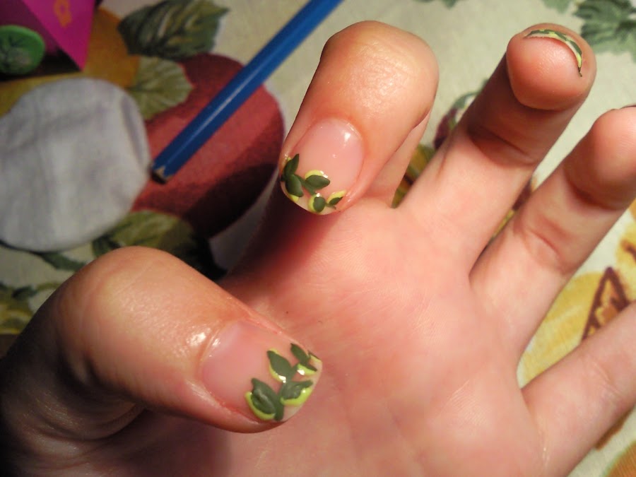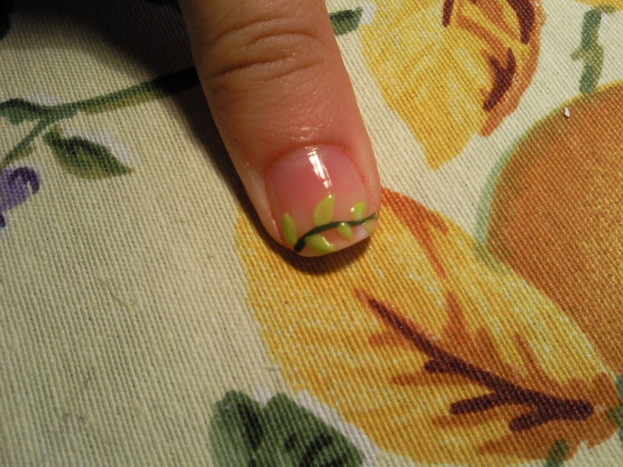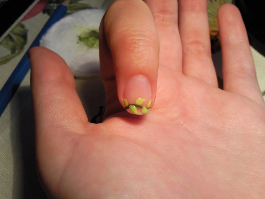 Seguidamente, con esmalte verde claro, hago un fondo de hojas sobre la línea. Esto hará que las hojas tengan más vistosidad, pero no es necesario que sean perfectas.