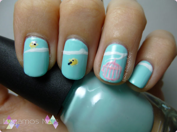 Tonos claritos, pastel y cremosos, azul, rosa, amarillo y blanco. He intentado hacer un nail art delicado y con dibujos sutiles, espero haber conseguido lo que quería, aunque hay que fijarse bien en el dibujo para adivinar lo que es, ¿no?