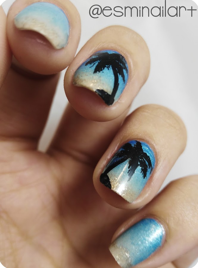 Ya se va notando (¡demasiado!) el calorcito y el verano, así que hoy, para no desentonar, os traigo una manicura muy muy veraniega... ¡¡Una playa con sus palmeritas!! Este tipo de manicuras llevaba en mi lista de pendientes un montón de tiempo, así que hoy por fin os muestro el resultado...