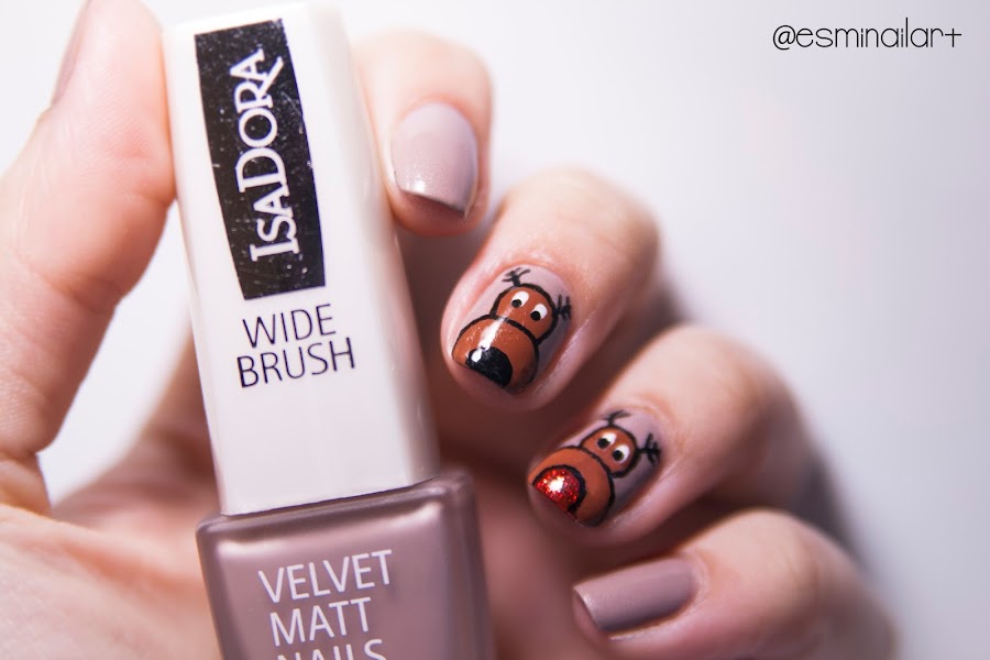 La manicura está realizada completamente con una dotting tool y el propio pincel del esmalte. El esmalte base utilizado es el 820 Soft Skin de la colección Velvet de Isadora, pronto os enseñaré los swatches de los esmaltes de Isadora que he probado. El reno lo realicé con el esmalte Tanned & Ready de Color Show y el resto con pintura acrílica.
