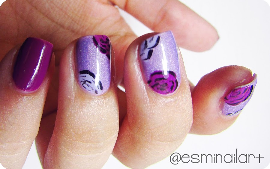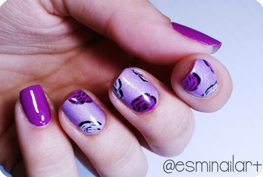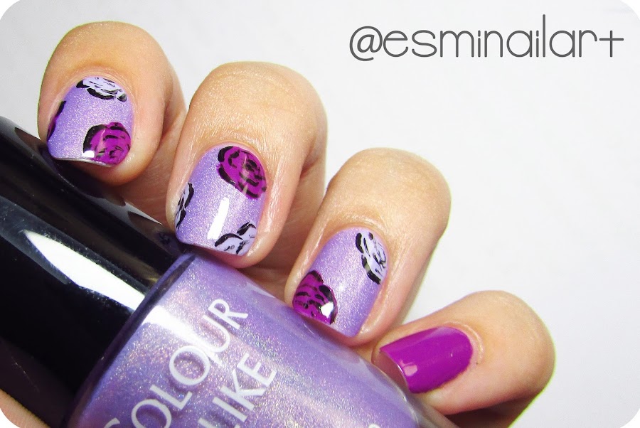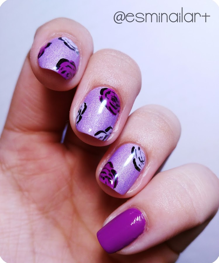 El esmalte de base es el 511 de la colección Pastel Holo de la marca Colour Alike, junto con el 05 de la colección Pop Your Style de Deborah Milano. Como veis, decidí hacer unas rosas un tanto abstractas con el propio esmalte morado de Deborah Milano y el XXX de la misma marca.