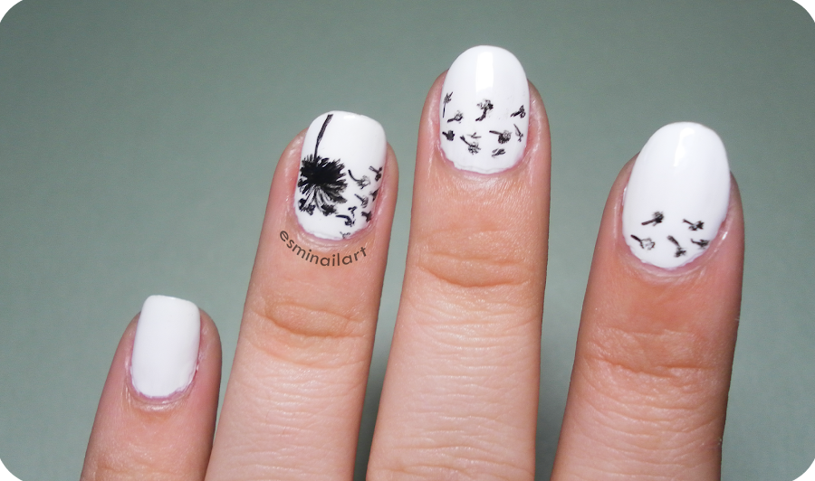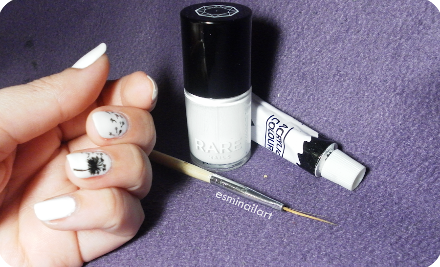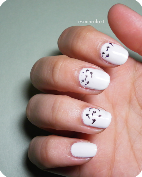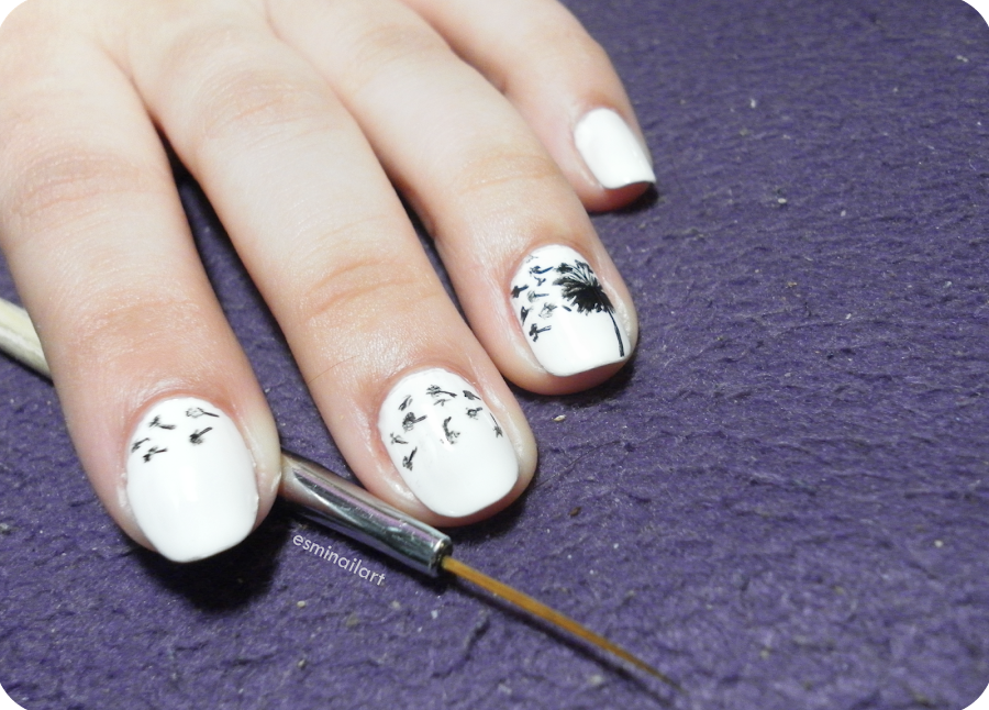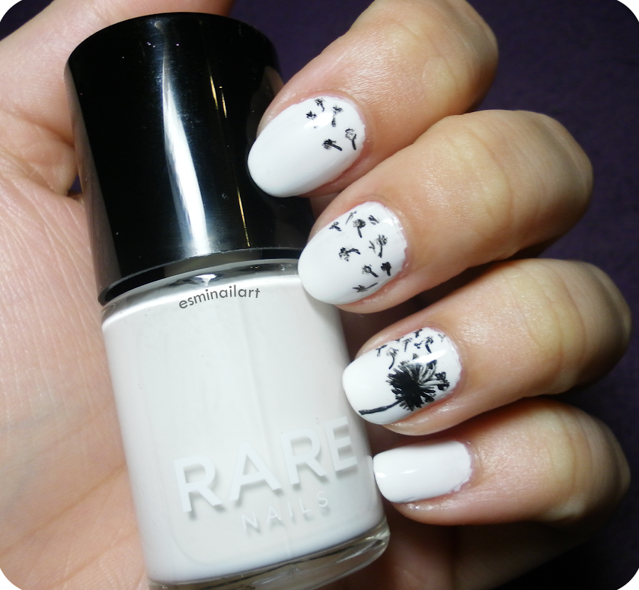 Como base, utilicé el Milk de Rare Nails, un blanco muy muy cubriente de estos que parecen tippex. Por encima, con pintura acrílica y un pincel largo y fino de nail art (adoro este pincel) hice el diente de león en el dedo anular y las "hojitas" o como se llamen volando en las uñas del corazón e índice. Admito que en la mano derecha solo hice las hojitas volando, me veía incapaz de hacer otro diente de león jajajaja
