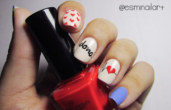 El esmalte de base es el Beige de la colección de verano de Perfect Beauty by Juliette Crowe y el 97 de la gama Prêt à Porter de Deborah Milano. Realicé una estampación del corazón con la placa BM411 de Bundle Monster y el esmalte Reddish de estampar de Mundo de Uñas. En el dedo corazón, con pintura acrílica, dibujé la palabra "dona". Por último, la uña del índice la llené de pequeños corazones con el esmalte Rojo coral de Perfect Beauty by Juliette Crow.