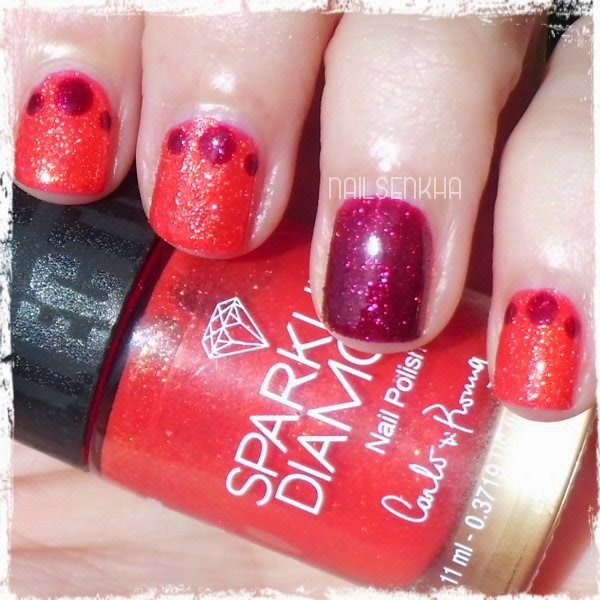*Cuando este seco en las uñas de color rojo hacemos unos puntos con el tono granate, los puntos y el tamaño de ellos ya depende de los gustos de cada una.