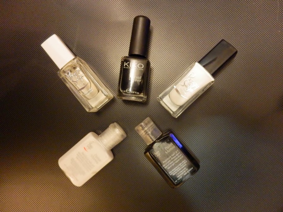 En mi caso he utilizado un pincel fino para detalles, un dotting tool y pintura acrílica en blanco y negro. Se puede hacer con esmaltes igualmente, la ventaja es que la pintura se puede corregir antes de que seque. Los productos que he usado son los siguientes: