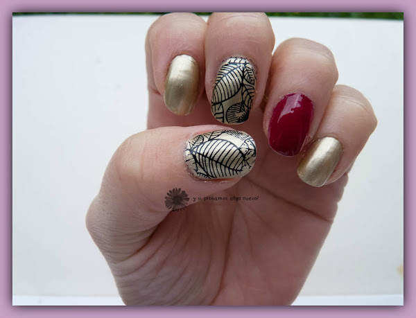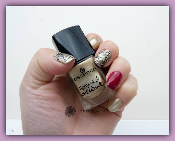 Hace un tiempo que no os traigo una manicura y ya tenía ganas de enseñaros este esmalte dorado de Essence de la colección Lights of orient. He estampado unas hojas en negro para darle contraste y una uña en color frambuesa, aunque en las fotos se ve más bien granate.