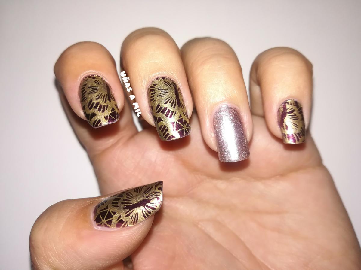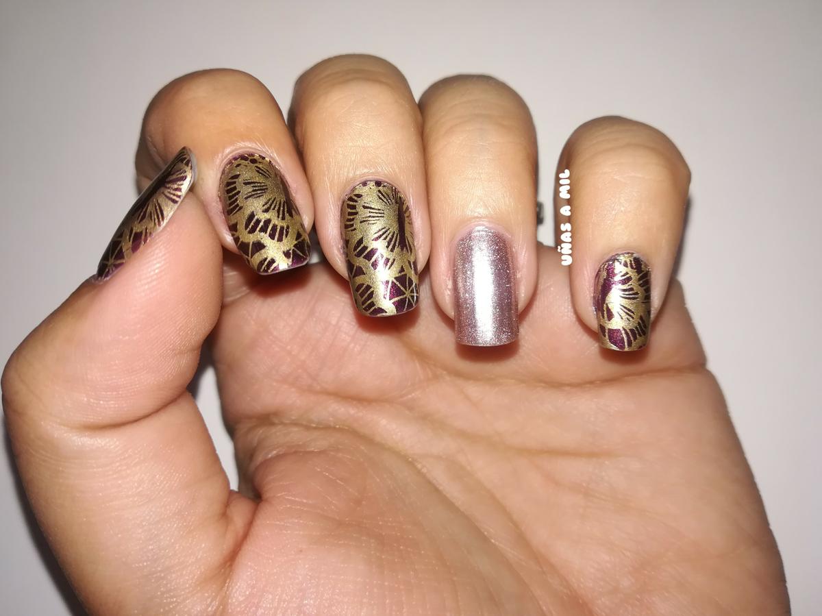 Los esmaltes que he utilizado son los de la marca Brische que compré en la feria Salon Look, y para estampar he utilizado el dorado de Hema, que los esmaltes metalizados de esta marca estampan fenomenal y los utilizo muchísimo, ¡porque quedan preciosos!.