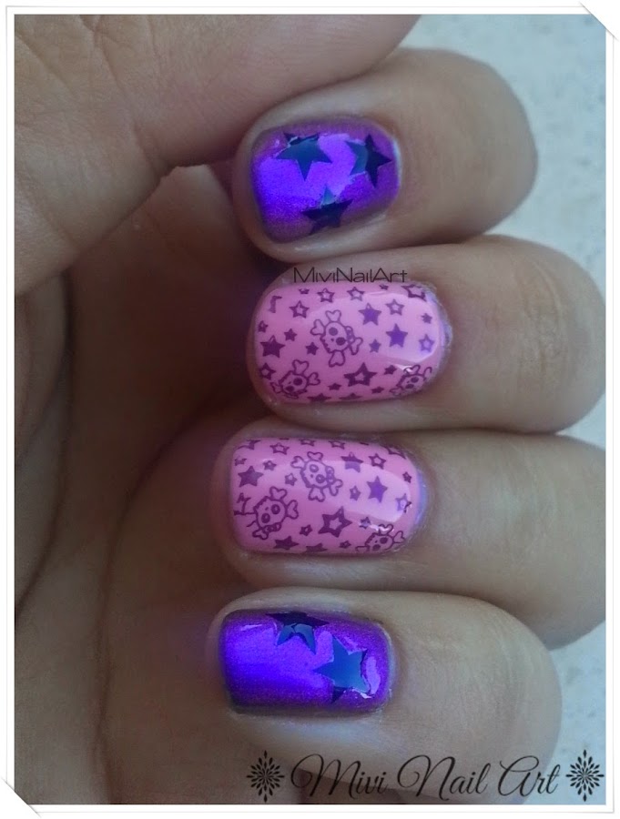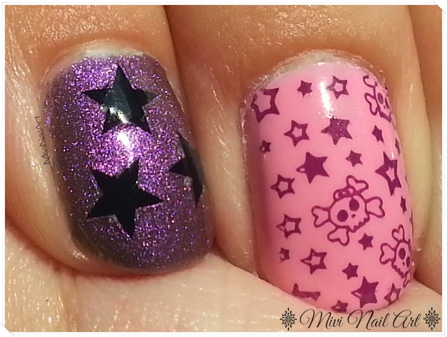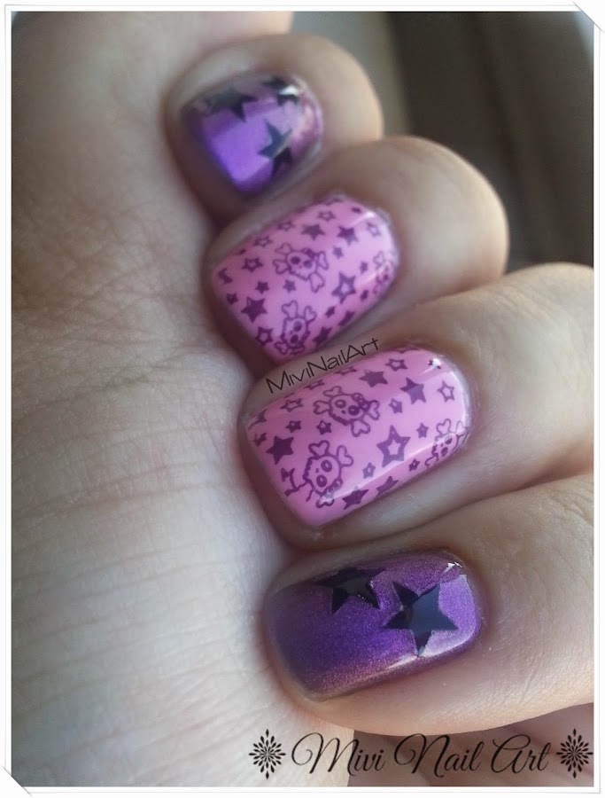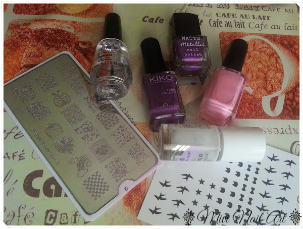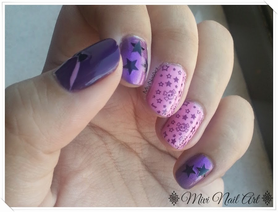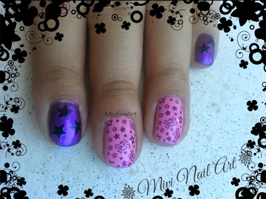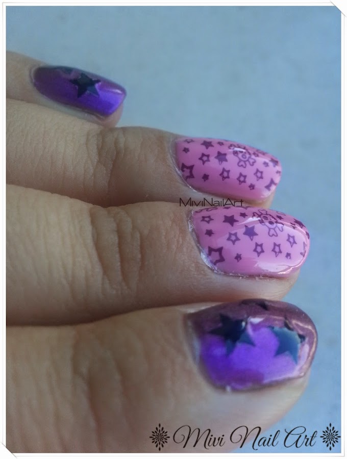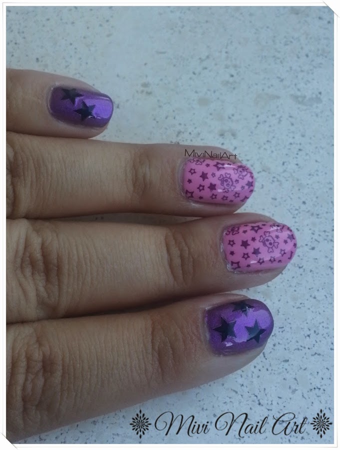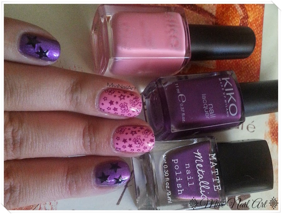 Base "Pro White Gloss" de Essence, Matte Metallic de H&M "Purple Metal", Rosa 506 y Morado 315 de Kiko, Top Coat Poshé, pegatinas estrella del Kit Easy Nail Art de Bourjois y placa nº 10 de la "Princess Collection" de Moyou London.