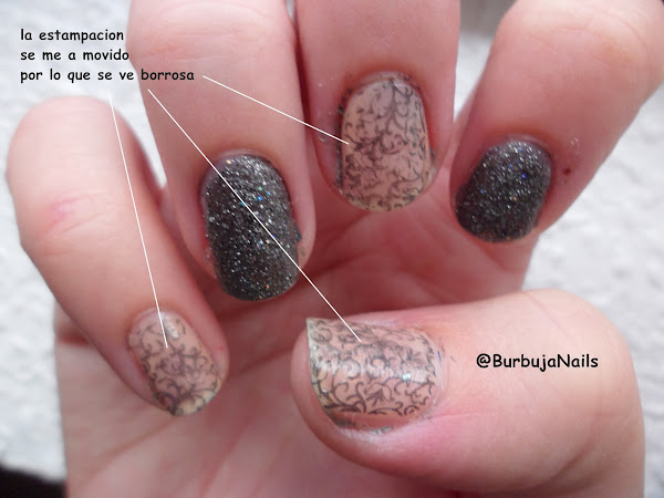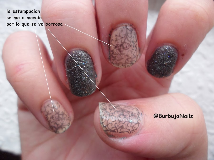 El principal motivo por el que esta manicura me salio falsa fue los esmaltes que usé ya que para estampar elegí uno equivocado, no! equivocadííííísimo!!!! Como muchas sabéis soy novata en el tema de la estampación y todavía me queda mucho que mejorar y desde aquí os digo que no intentéis estampar nunca con un esmalte con textura porque a parte de que es super difícil os quedara una chapuza de manicura como en mi caso.