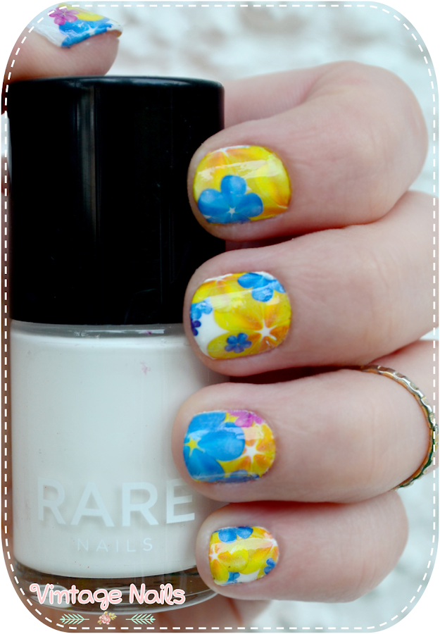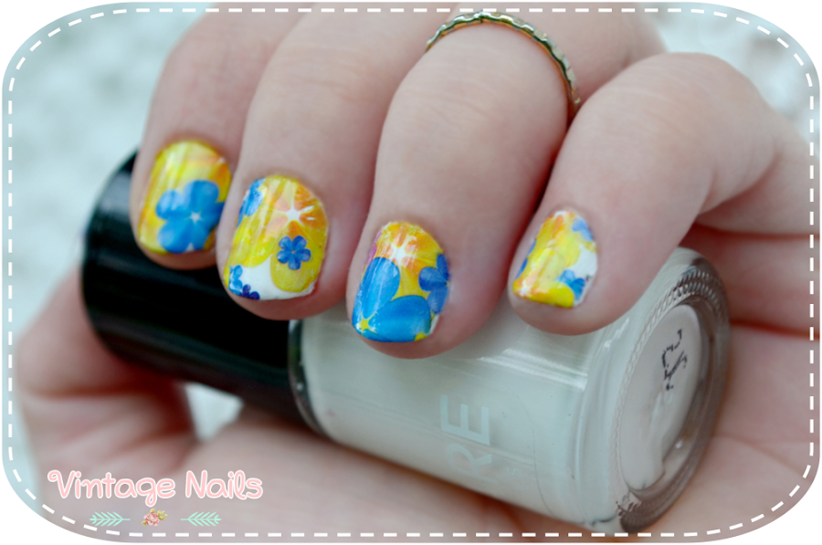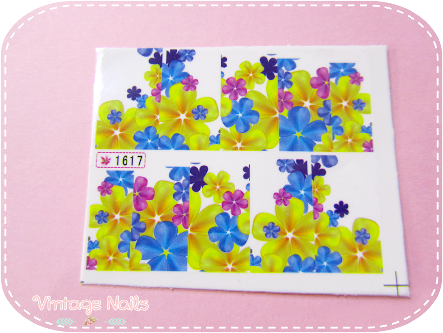 Las water decal que he escogido yo son las 1 sheet Colored Floral Flower Patterns Nail Water Decals Transfer Stickers (#1617) y cuestan 2"86$, aunque ahora están rebajadas a 1"43$. Como veis, es un diseño floral en amarillo, azul y un poco de rosa. El diseño es lo suficientemente ancho para mis uñas, me han quedado justitas.