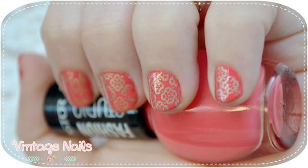 Escogí un diseño floral de la placa BM-404 de Bundle Monster y para estampar utilicé el esmalte nº 628 de los Mirror de KIKO, que es un color dorado que combina a la perfección con el coral.