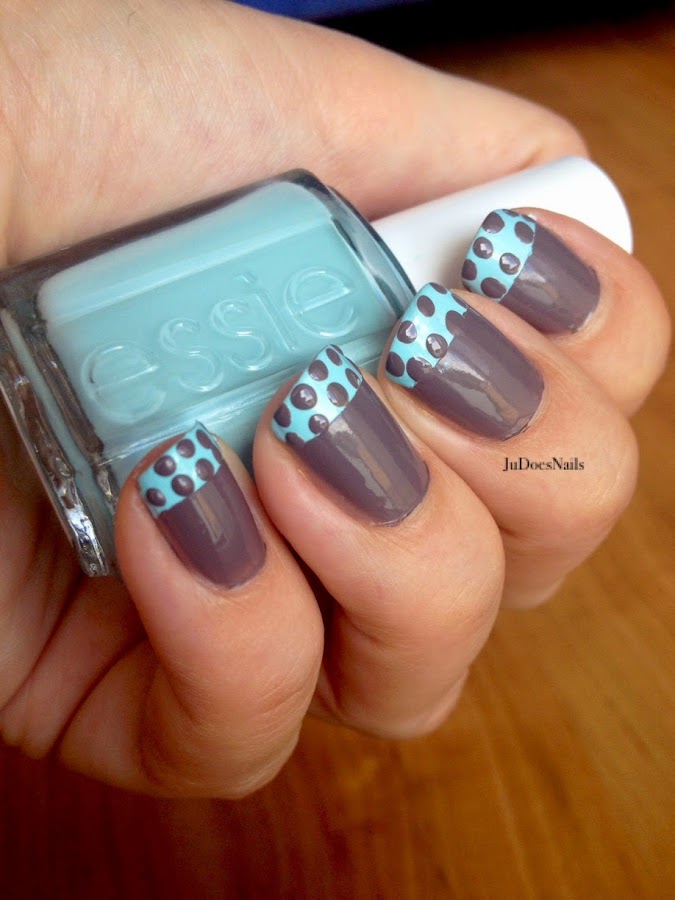 Y ahora a por el nail art sencillo que he hecho, primero de todo se pinta la francesa con el esmalte de Essie Mint Candy Apple y cuando está seco se pintan los topitos con el mismo esmalte de Kiko 320. Éste es el resultado: