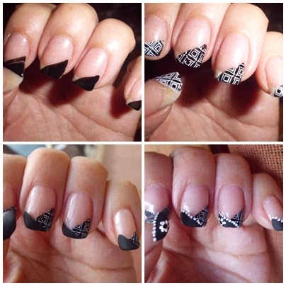 Escoge la estampación que quieres llevar. Y haz el estampado sobre el esmalte negro brillante con esmalte blanco.