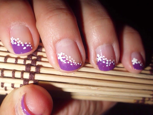 Es simplemente una manicura francesa hecha un poco en oblicuo y que tiene una florecilla y una estela de puntitos blancos de varios tamaños.