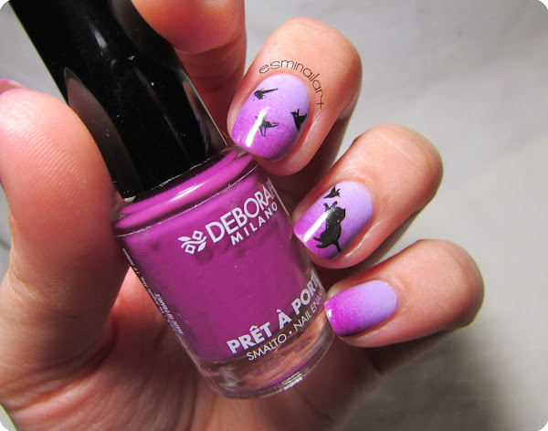 Así, la base del nail art fue un degradado en tonos morados con el esmalte 612 de Deliplus y el esmalte 05 de los Pop Your Style de Deborah Milano. El truco que suelo utilizar yo para que mis degradados queden lo mejor posible es, una vez aplicados los dos tonos en la esponja, mezclar la zona de unión girando por encima un palito de naranjo. ¿Os gustaría ver un tutorial sobre esta técnica?