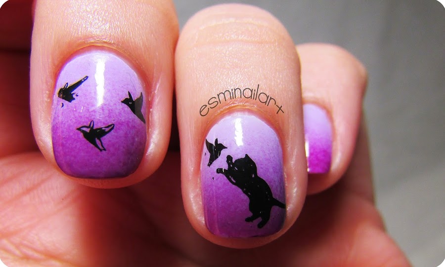 Una vez realizado el degradado, estampé en las uñas del anular y corazón un precioso gatito jugando con un pájaro y unos pájaros volando, como si escaparan del gatito. Para eso, utilicé la placa 11 de la Kitty Collectión de MoYou London (podéis ver mi opinión sobre estas placas aquí). El esmalte que utilicé fue el esmalte negro 135 de Wynie.