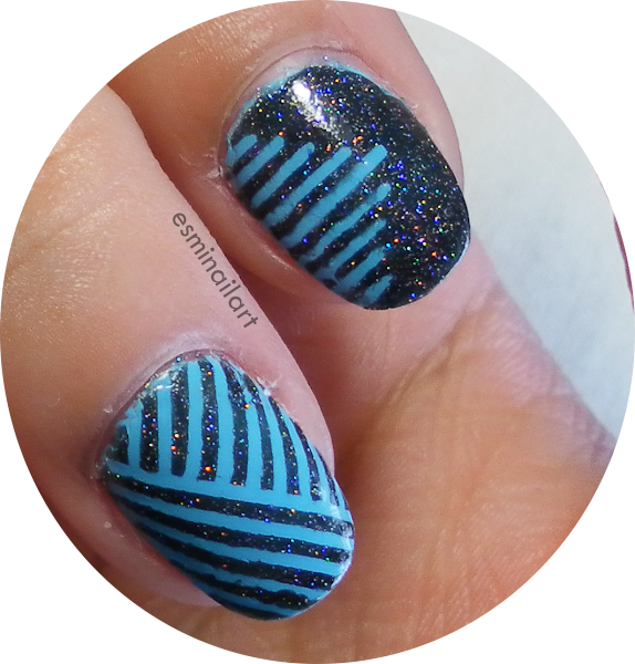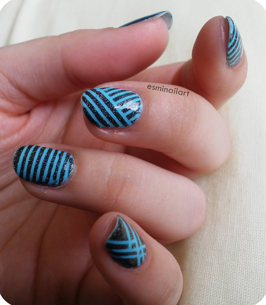 El diseño está hecho con nail tapes y... menudo desastre!! Tardé bastante en hacerla, pero sobre todo porque había muchos trozos de cinta que quitar y como a veces no lo daba hecho muy rápido se me secaba un poco el esmalte.... Pero bueno, quedé contenta con el resultado, aunque para la próxima (que no sé si me animaré con tanta nail tape alguna vez más... jajaaja) igual cambiaría el color base, no sé.