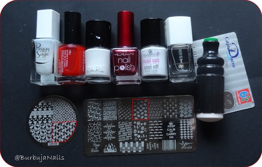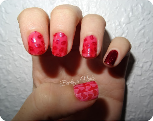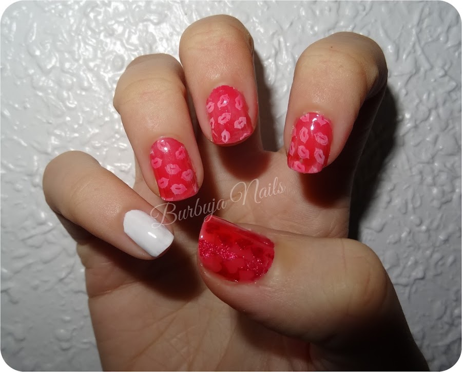 4. En el resto de las uñas estampamos los besos en rojo en la mano izquierda y en blanco en la derecha.