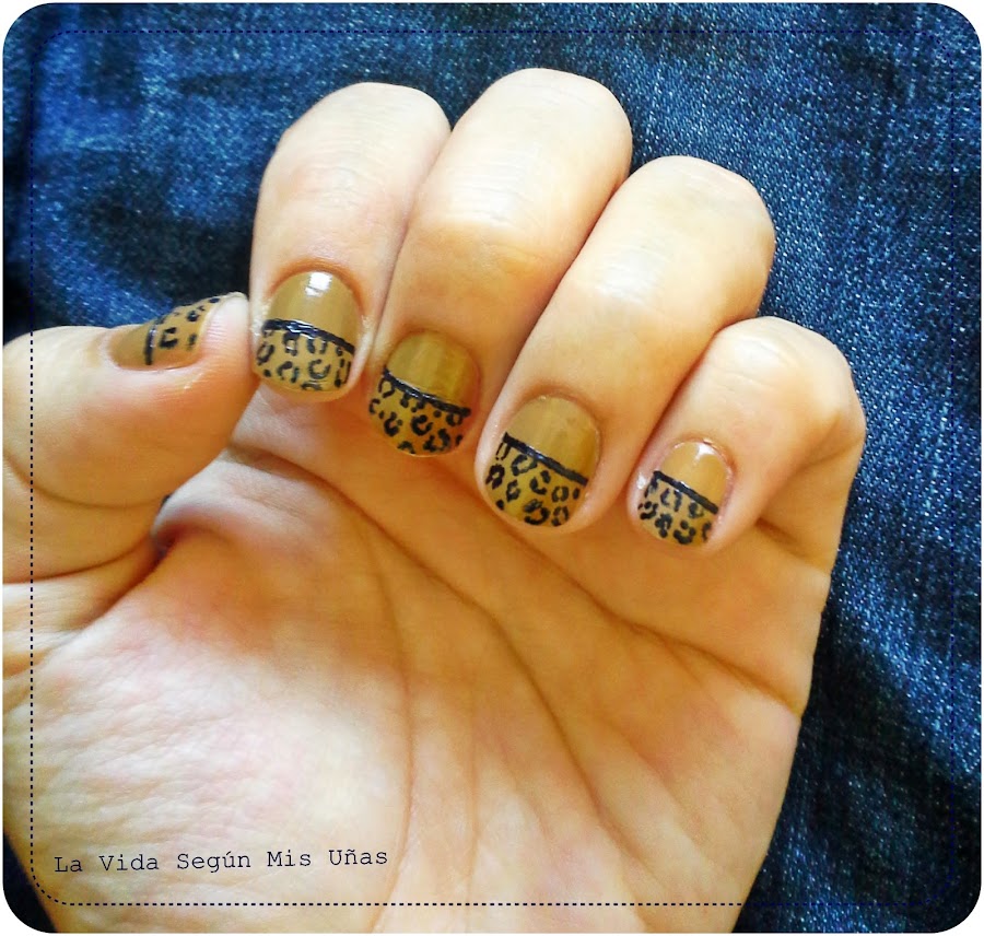 Una vez secas las uñas, dibujé el estampado de leopardo en azul oscuro,(solo el contorno, esta vez no he rellenado las manchas porque me gustaba más así ).