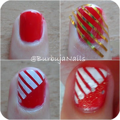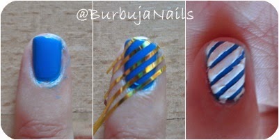 6. Con un trocito de fixo tapamos media uña y en el resto ponemos unas nail tapes, pintamos de blanco y retiramos.