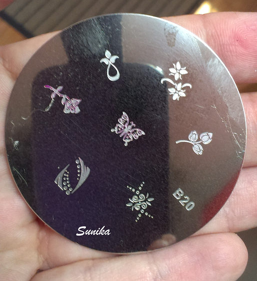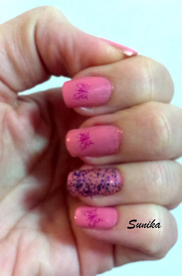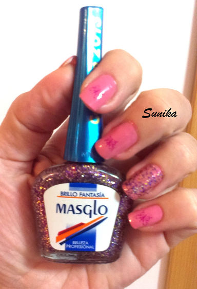 Para realizarla he usado dos esmaltes de Masglo, el rosita es el "Estupenda" y el glitter es el "Brillo Fantasía" me encantan los nombres que les ponen a los esmaltes. Después simplemente estampé una mariposa en las uñas.