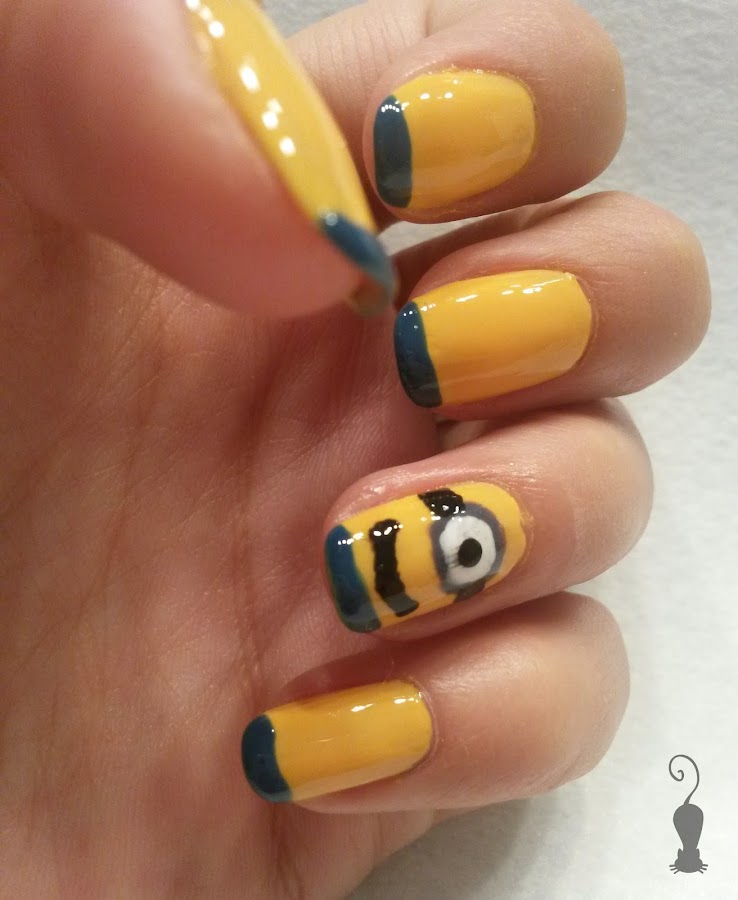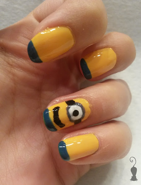 Buenas !! Vuelvo por aquí, para enseñaros una manicura más. En esta ocasión me apeteció animarme con algo de dibujos y les tocó a los minions, no es que sea super trabajada, pero me parece sencilla y divertida. Espero que os guste, los pasos que seguí, fueron los siguientes: Primero pinte todas las uñas de amarillo A continuación hice como si fuera la francesa pero en azul Y para darle el toque gracioso y diferente, en el dedo anular, dibujé a un minion, primero hice un circulo grande en gris, dentro otro más pequeño en blanco y para terminar, uno pequeño en negro, que será el ojo. Y luego la boca, y así quedo: