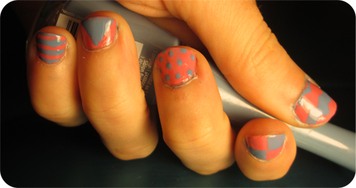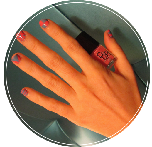 En el pulgar dibujamos un zigzag hecho con celo y tijeras para cortar con este motivo; en el índice, un diseño tipo tablero de ajedrez. El dedo corazón tiene unos polka dots adorables. Para el anular, un diseño chevron, y en el meñique recurrimos a las líneas horizontales, dibujadas con la ayuda de la nailtape.