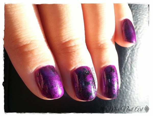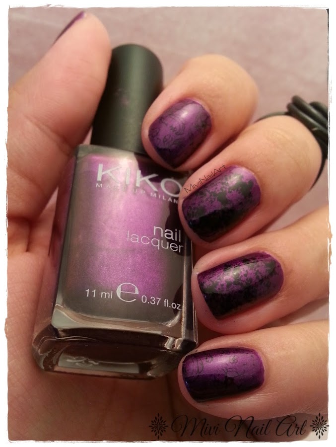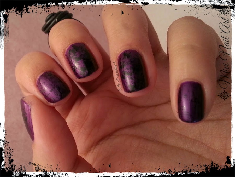 Se trata de una manicura en morado, con estampado en negro y con la técnica samura también en negro.