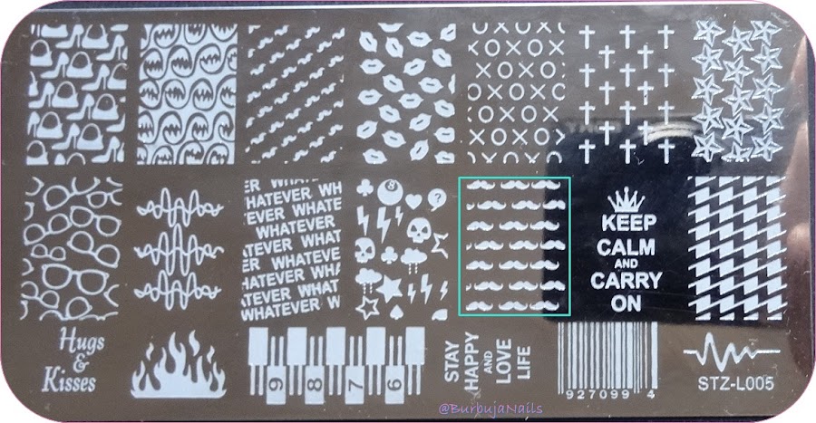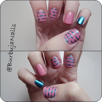 3. En las uñas salmón estampamos los bigotitos en azul, menos en la uña del anular que la dejaremos lisa.