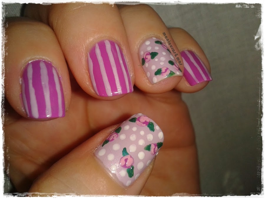 Me gustó mucho como quedaron en conjunto las líneas con las flores y la combinación de colores también... todo lo que sean tonos rosas lo veo bien para las uñas! jajajajaja