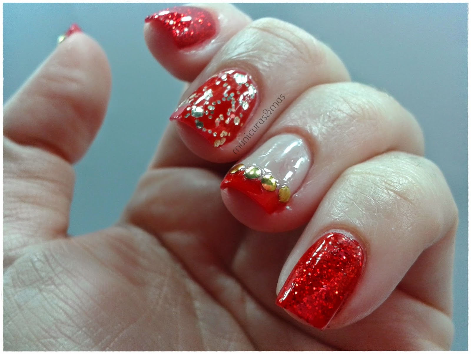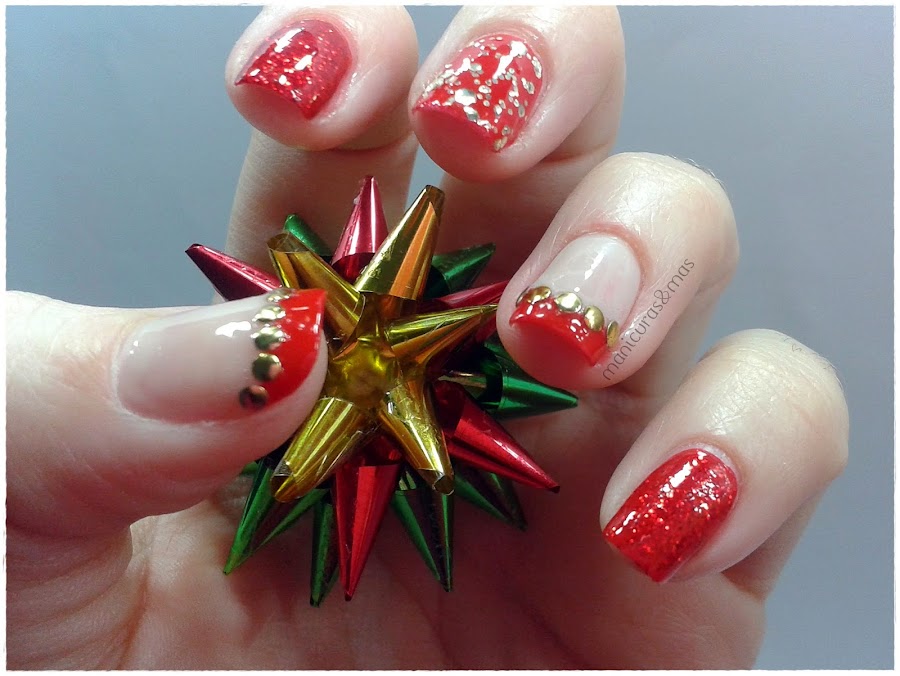 Como véis, he hecho un mix and match combinando una francesa en rojo con tachuelas doradas y glitter en las otras uñas.