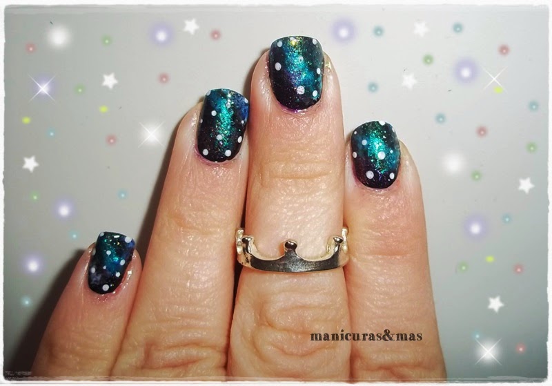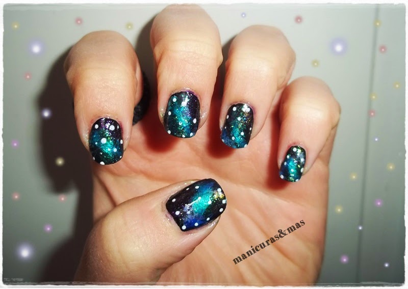 Al principio no me gustaba el resultado pero fue ir haciéndole los puntitos blancos a modo de estrellas y gustarme más. Poner los puntos blancos es lo que hace que ya parezca una galaxia, aunque eso si, es una manicura bastante entretenida de hacer, ya que tienes que estar dando con una esponjita toques con cada color. De este modo se difuminan más los colores y quedan muy bien integrados sin que se vea ningún corte entre ellos.