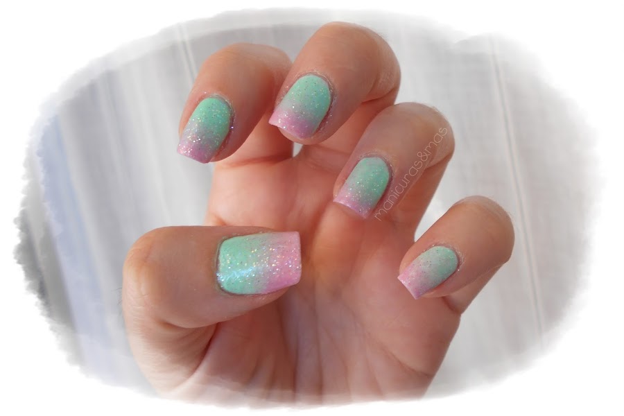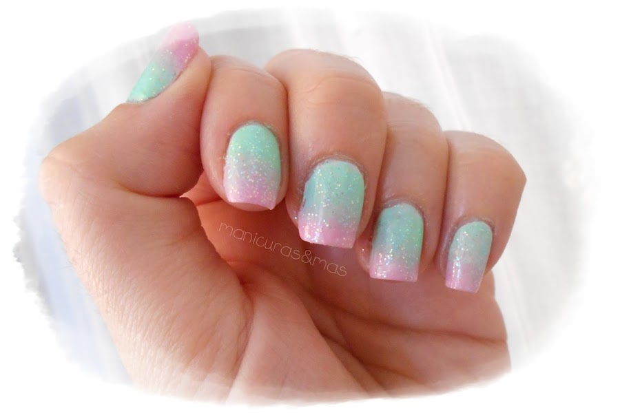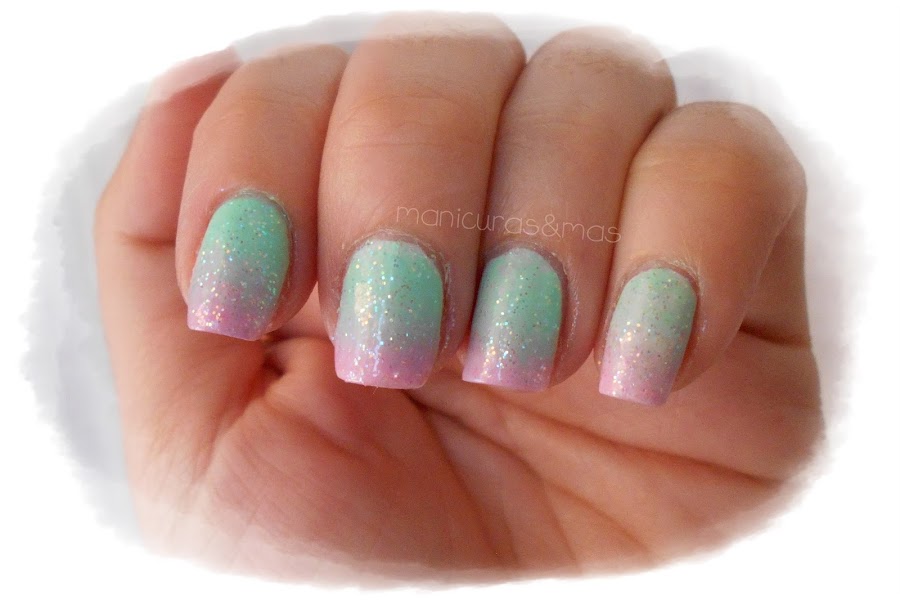 Como truco, si no lo sabéis, puse una capa de esmalte blanco como base para que el degradado se viera mejor con menos pasadas de la esponja. Para finalizar esta vez usé un esmalte con purpurina pequeña que le da mucho brillo a la manicura.