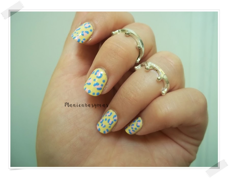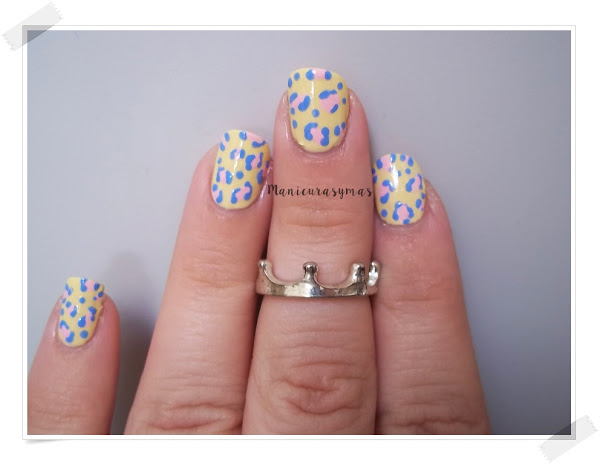 Como os decía antes, he querido escoger estas tonalidades para hacerla un poco más veraniega. Me gusta mucho como resalta el amarillo pastel con este azul. A esta estilo de manicura me gusta cambiarle los colores porque si no no me suelen gustar (este estampado me recuerda al "chonismo").
