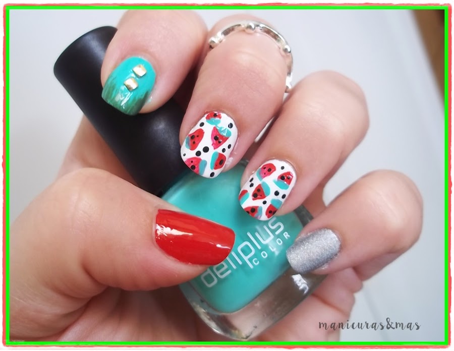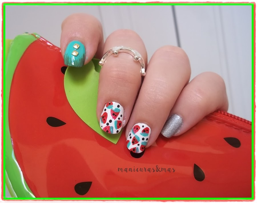 Como veis queda muy veraniega este tipo de manicura. Como a mi no me gustaba las sandias en todas las uñas, solo las hice en el dedo corazón y el anular. En el meñique puse un esmalte holográfico en plateado (es precioso cuando le da el sol), en el dedo índice intenté recrear las rallitas que tiene la sandia y le puse unas tachuelas en plateado. Y por último, el dedo pulgar lo pinté de esmalte rojo.