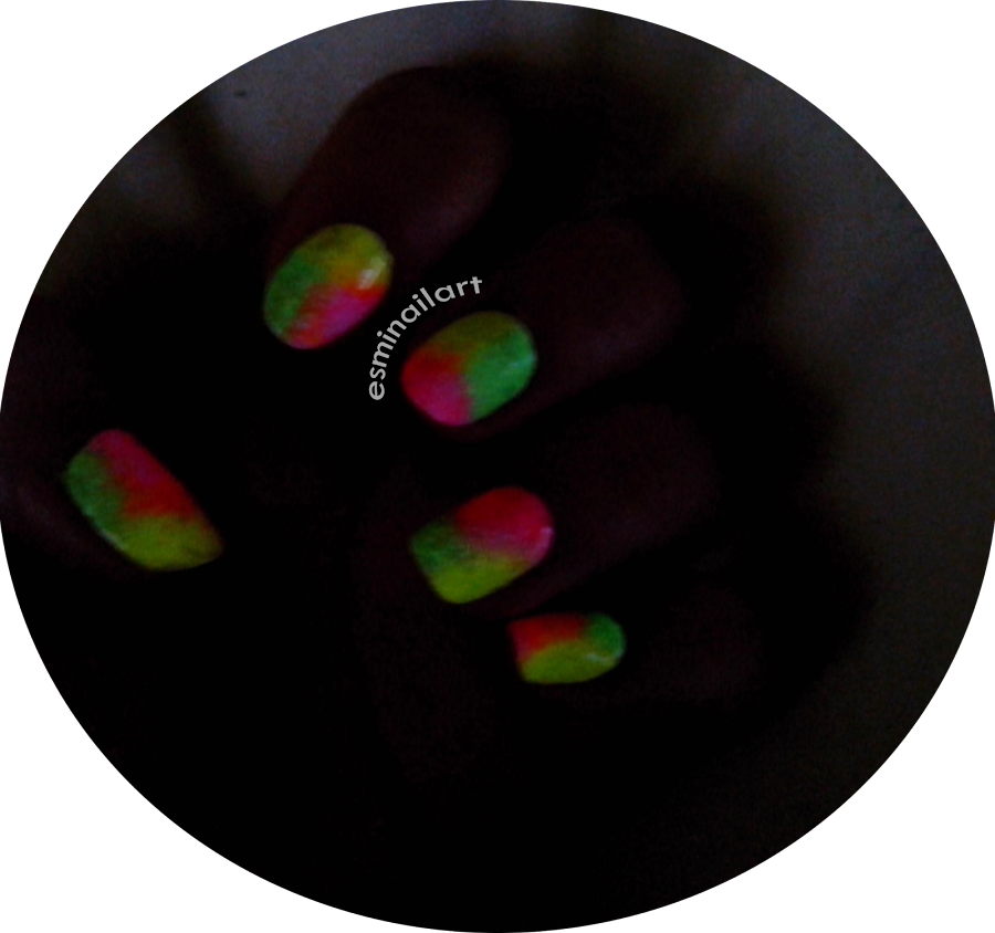 La verdad es que el resultado me gustó bastante, en las fotos no se ve ni la mitad de lo llamativos que son los tonos, no conseguí captarlos ni con la cámara ni con el móvil... Además, los esmaltes son glow, es decir, brillan en la oscuridad!! Es una pasada, cada vez que me pongo este tipos de esmaltes me quedo como una tonta mirándome las uñas en la cama a oscuras jajajjaja