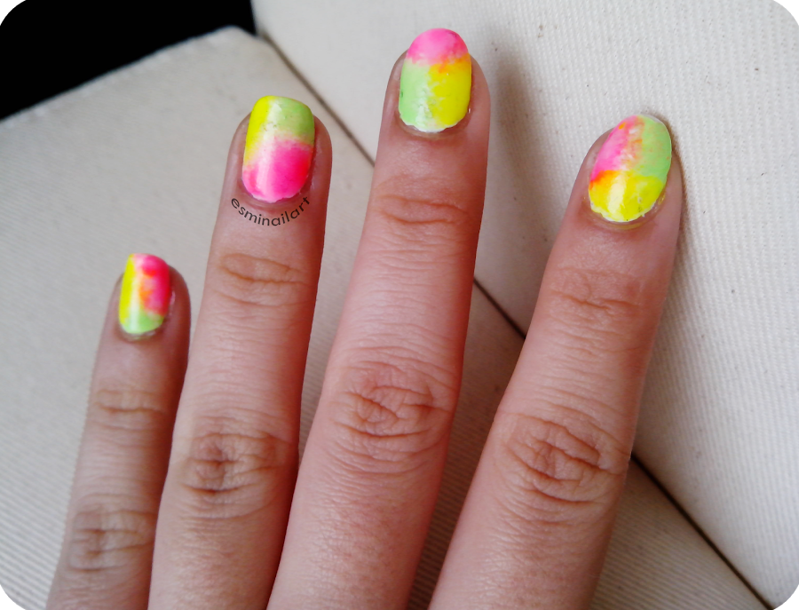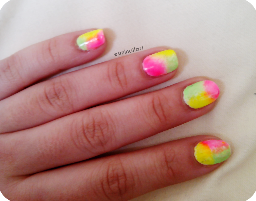 Para hacer la manicura puse una base protectora (la Hardening nail base de Essence), una capa del Milk de Rare Nails y, por último, pinté las formas qué quería en una esponja y fui dando a toques en la uña. Los tonos que escogí fueron un amarillo neón, un rosa neón y un verde neón de la marka BK (los compré en eBay el verano pasado) los números 01, 15 y 03 respectivamente. Una capa del sealing top coat de Essence y listo!!