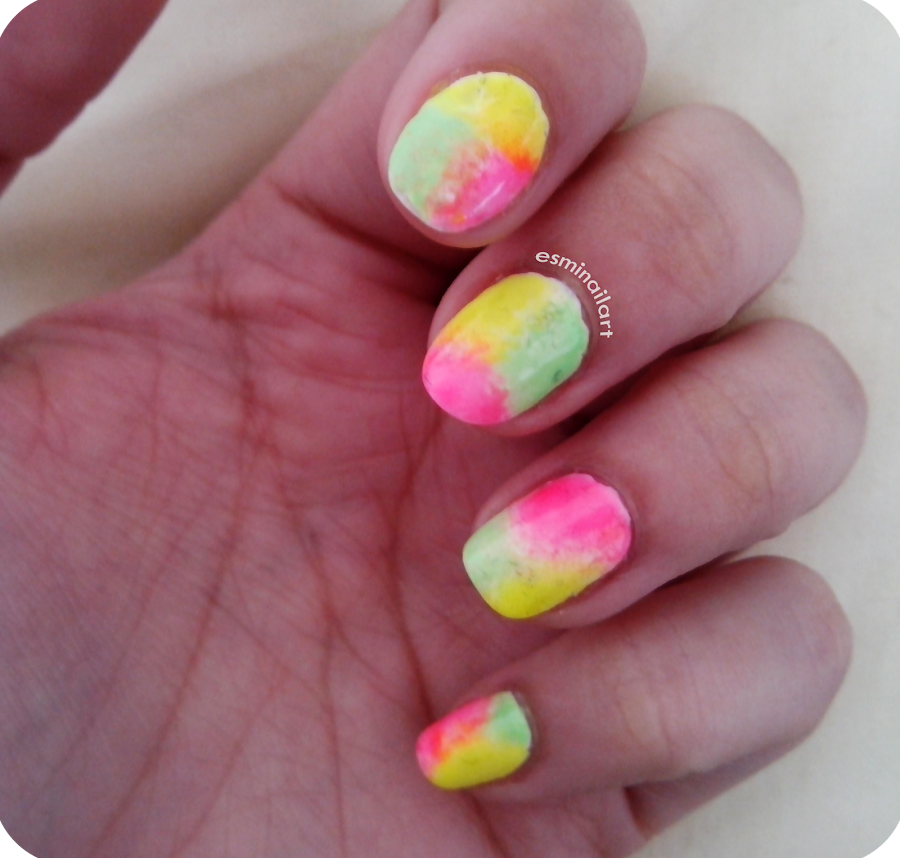 Para hacer la manicura puse una base protectora (la Hardening nail base de Essence), una capa del Milk de Rare Nails y, por último, pinté las formas qué quería en una esponja y fui dando a toques en la uña. Los tonos que escogí fueron un amarillo neón, un rosa neón y un verde neón de la marka BK (los compré en eBay el verano pasado) los números 01, 15 y 03 respectivamente. Una capa del sealing top coat de Essence y listo!!