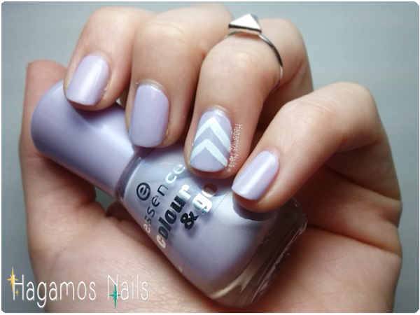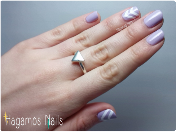 Sobre el diseño, sencillo, dos rallitas haciendo triangulito en blanco. Los hice a mano alzada, iban a ser más ancho el de arriba y más fino es de abajo (el que está más cerca del borde libre de la uña), pero el pincel se puso en contra mía y me salieron iguales. De todas formas no quedó mal, ¿no?