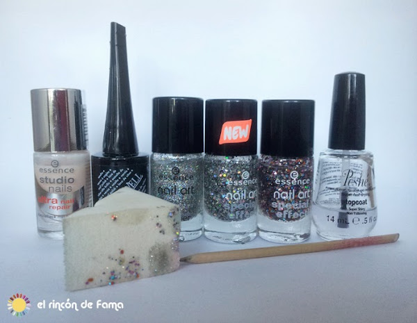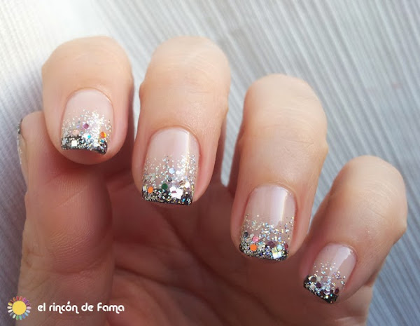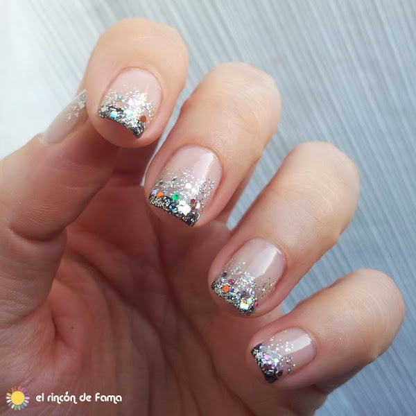 Para el degradado apliqué los tres esmaltes de Essence con ayuda de la esponja para no "engordar" demasiado las uñas, dando más intensidad de glitter en las puntas y recolocando un poco los gllitters de mayor tamaño. En total media hora para las dos manos y a disfrutar del bodorrio!!!! jejejeje