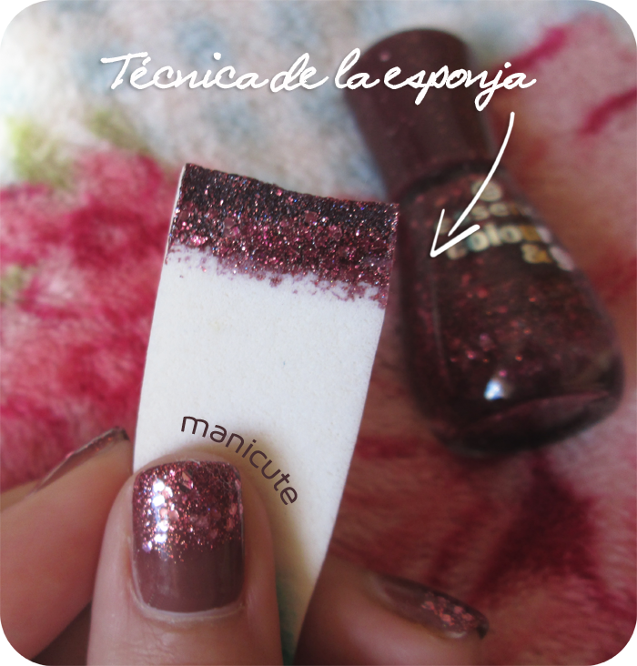¡Continuamos con la manicura! Una vez tuve bien seca la base marrón, pinté directamente con el esmalte de glitter cobrizo de essence sobre una esponjita de maquillaje, y de ahí apliqué en la uña una primera capa. Gracias a esta técnica, que conozco por Nailwish (podéis ver el tutorial aquí) se puede aplicar cualquier esmalte de purpurina sin que tarde mil siglos en secar. En mi caso, apliqué una segunda capa de glitter sólo en las puntas para crear el efecto degradado, y gracias a la esponja no me quedó abombada la manicura. Una gozada.
