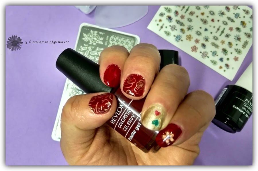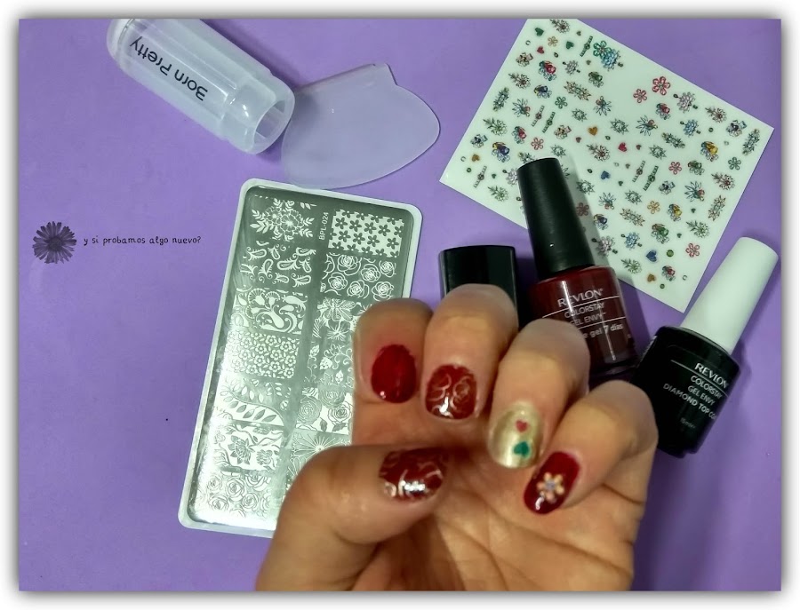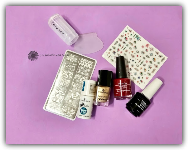 A continuación he usado unas pegatinas del lote que me tocó en el sorteo del blog The crazy dremland, en el meñique y en el anular. Y por último he estampado unas flores en dorado con la placa que compré en Aliexpress, os la enseñé aquí. Primero hice una prueba para estampar en negro las flores pero no me gustó el resultado y decidí hacerlo en dorado, a mí me gusta mucho más así, destaca más.