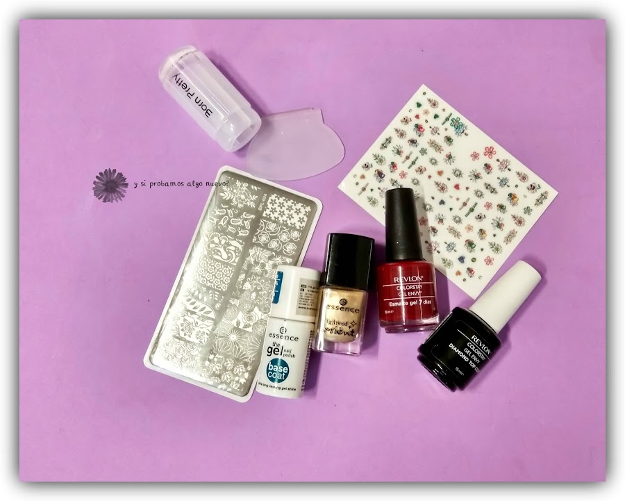 Esto es todo lo que he usado para esta manicura. He cubierto todas las uñas con la base en gel de Essence, la verdad es de las que más me están gustando hasta ahora. He pintado todas las uñas excepto la del anular con este rojo de Revlon. Venía en un pack con el top coat y otro esmalte más rosa, creo que es de la colección inspireds. El anular lo he pintado con el dorado de Essence de la colección lights of orient. Siempre me doy dos capas sea cual sea el esmalte.