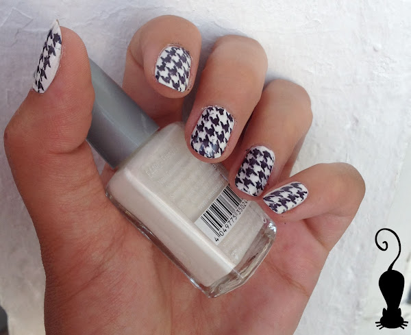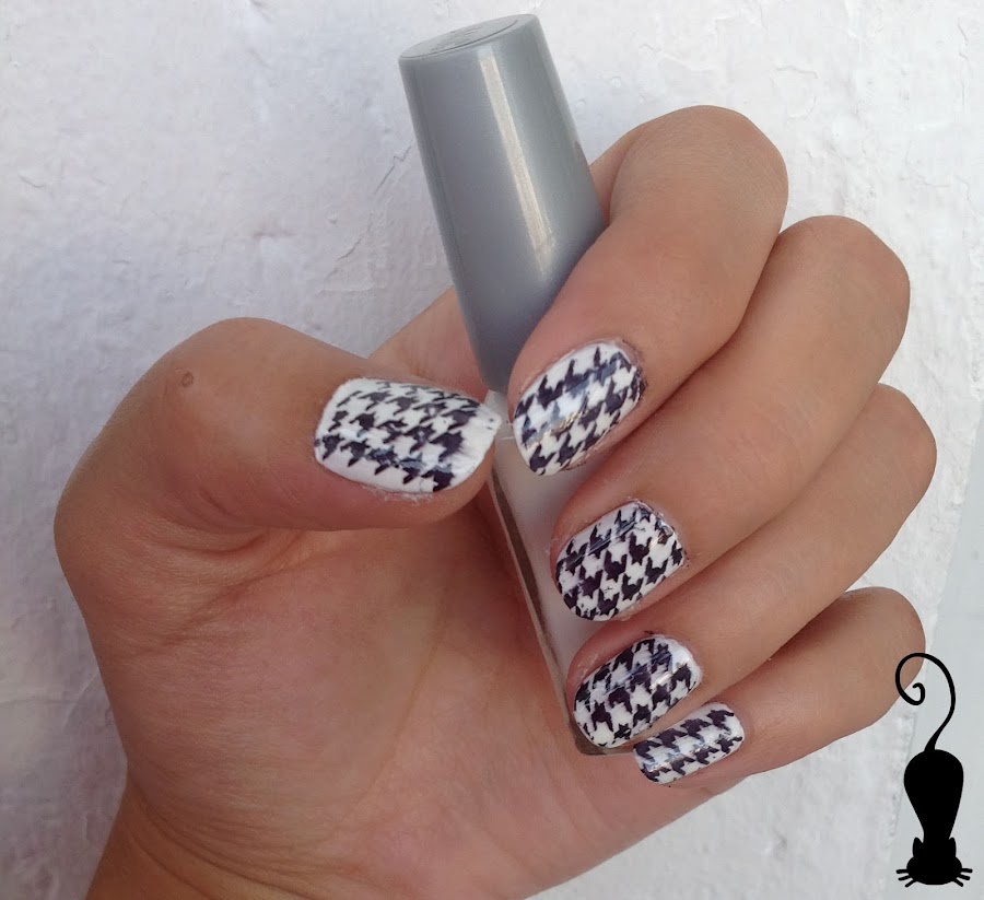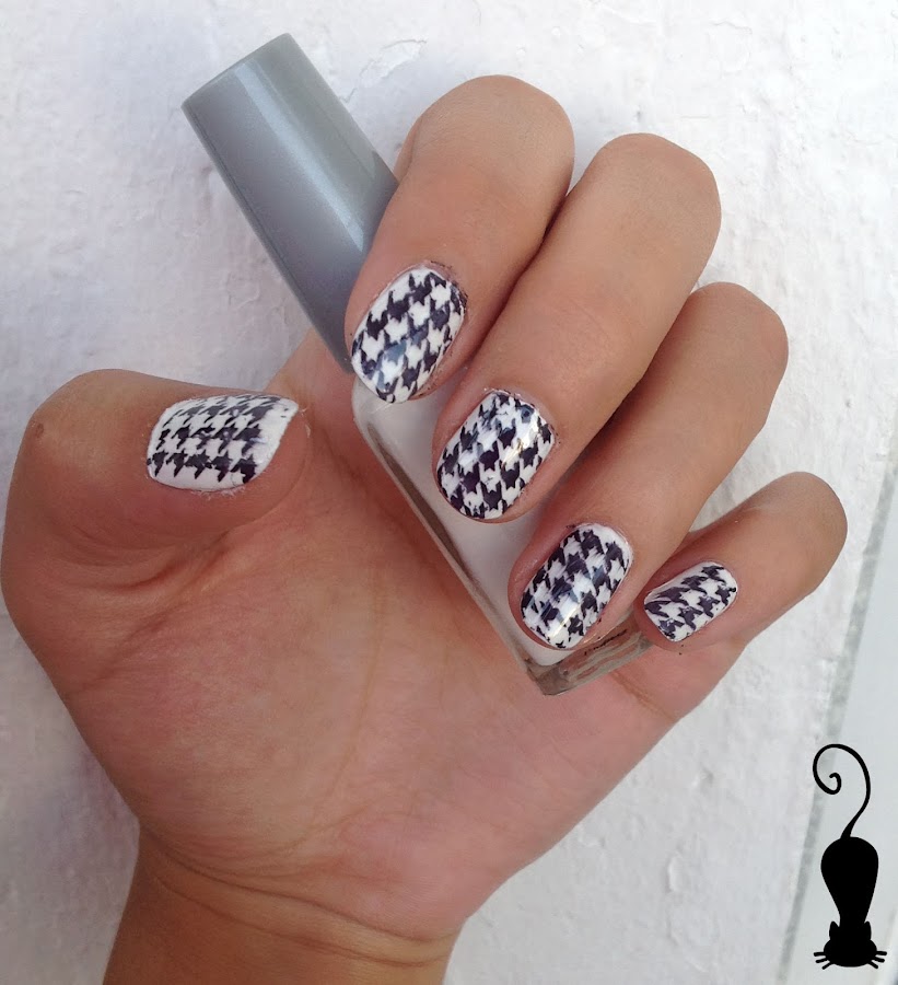 Esmalte negro de Konad, brillo gel look de Essence, rascador y sello